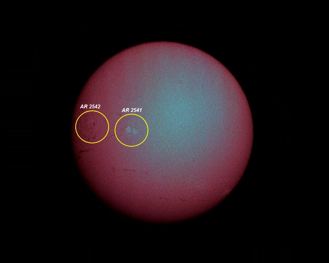 Em 06 de maio de 2016, fotografamos o conjunto de manchas AR 2541 (grupamento de 6 manchas), às 14:33:35 e o conjunto de manchas AR 2542 (grupamento de 3 manchas), às 15:07:10. Utilizamos nessa missão o telescópio refrator solar Coronado PST (40mm/400mm) com filtro H-Alpha e o telescópio refrator APO Tele Vue 85 (85mm/600mm) com filtro de luz branca Baader Astro Solar Safety.  Os telescópios estavam instalados em duas montagens Alt-Azimutais VIXEN Porta. A câmera utilizada foi a Orion StarShoot Solar System Color Imaging Camera IV e as fotos foram feitas com apenas 1 frame.