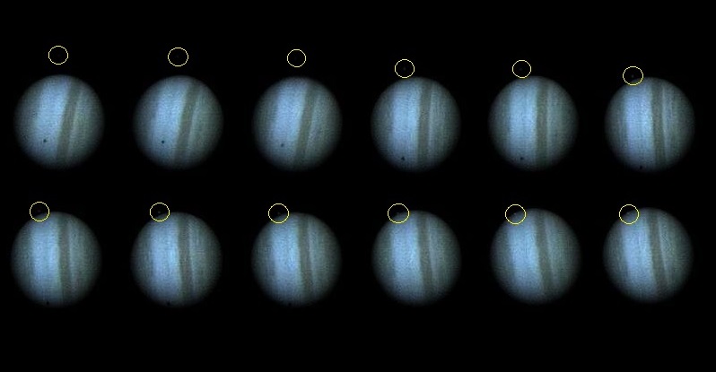 Imagem: Composição fotográfica mostrando o trânsito quase tangencial da lua Europa de Júpiter. Fotos obtidas em 25 de junho de 2010, iniciando às 04:49:15 – VTOL.