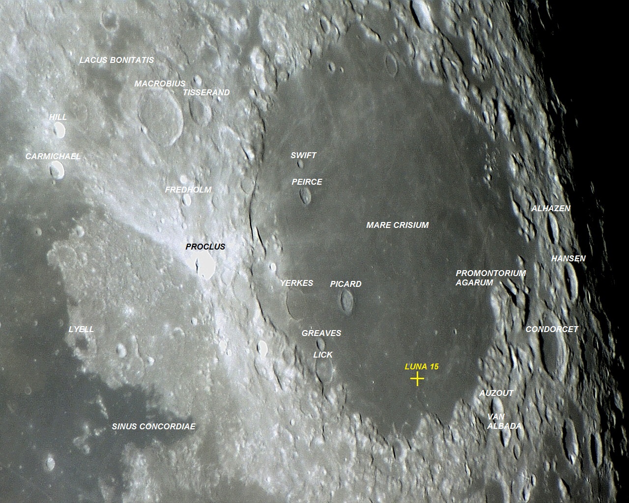 Lançada à bordo do foguete soviético Proton-K/D partir do cosmódromo de Baikonour, apenas três dias antes da missão Apollo 11, a sonda Luna 15 foi a terceira tentativa soviética de coletar amostras na superfície lunar e retornar com os espécimes para a Terra. Porém, por causa de uma pane do sistema direcional, a nave russa chocou-se com a superfície lunar em 17 de julho de 1969, às 15:50 UT. O impacto aconteceu no Mare CRISIUM nas coordenadas LAT: 17°00′00″ N, LON: 60°00′00″ E.