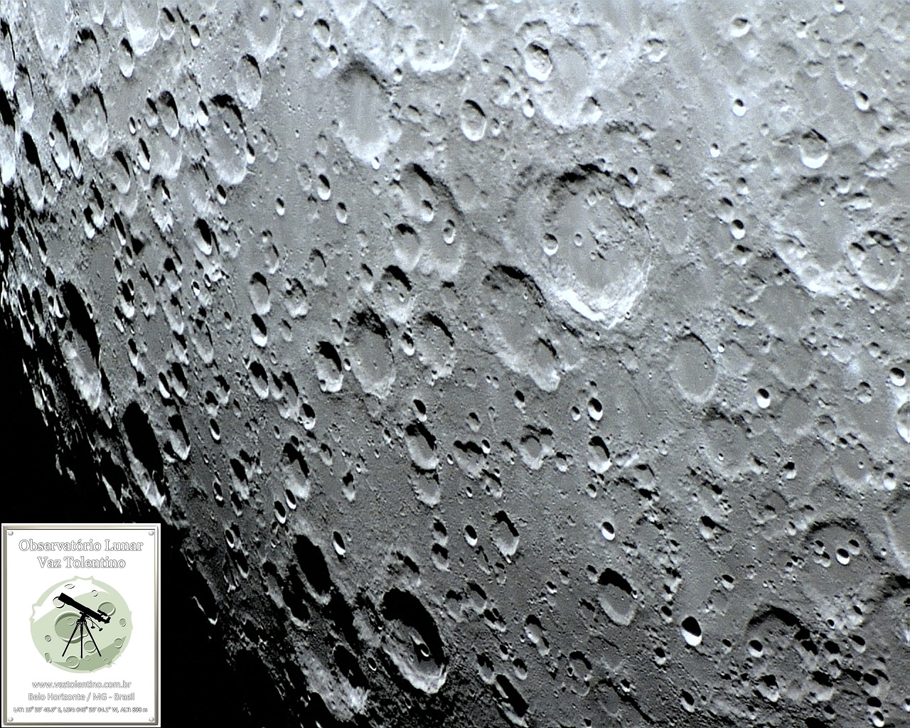 Exemplo de terras altas ou planaltos, próximo do polo sul lunar, no quadrante sudeste. Essa região é antiga, elevada, clara e cravejada por crateras de impacto de todos os tamanhos, que guardam os registros da rica história lunar. Foto (Norte para a direita) executada com apenas 1 frame por VTOL em 22 de fevereiro de 2011, 02:34:06.