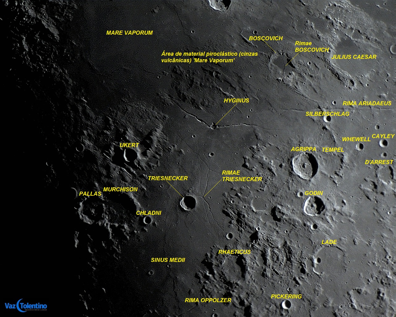 A região de HYGINUS é uma das mais interessantes de se observar em nosso satélite natural. Além dessa interessante cratera, a região é repleta de rimae, ou seja, canais que marcam a superfície lunar.