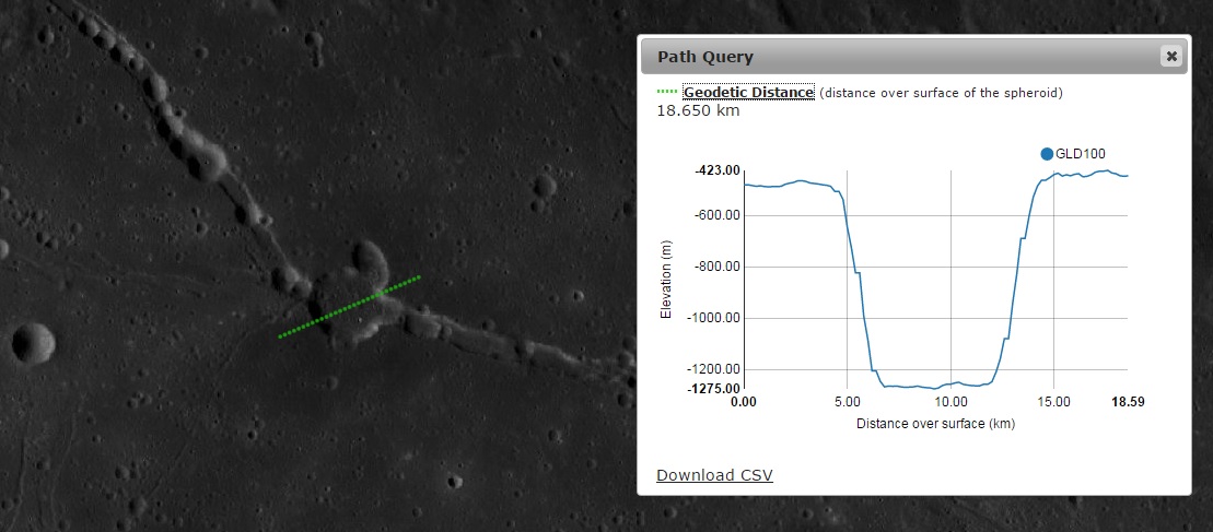 Imagem: O perfil altimétrico SW - ME da cratera de origem vulcânica HYGINUS - LRO QuickMap.