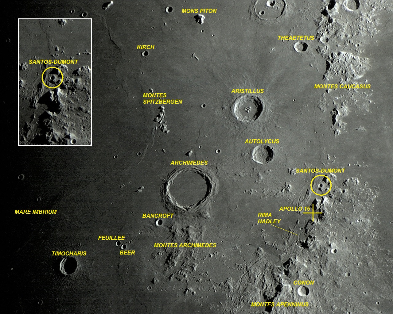 A Cratera SANTOS-DUMONT, inicialmente, era nominada Hadley B. Porém, em meados da década de 1970, a International Astronomical Union - IAU definiu o novo nome "SANTOS-DUMONT" para essa formação. Para a IAU, a pequena cratera homenageia Alberto Santos Dumont (1873-1932), segundo eles, apenas um engenheiro aeronáutico brasileiro ou um pioneiro da aviação brasileira. Lamentável!