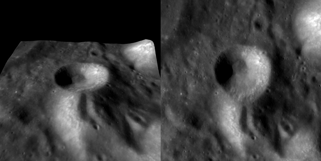 Composição: Fotos orbitais da Cratera SANTOS-DUMONT feitas pela sonda espacial robótica LRO da NASA.