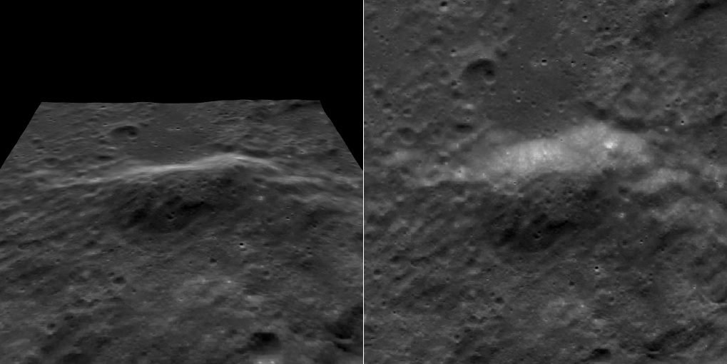 Imagem (Norte para direita): O destacado e isolado monte sem catalogação, fotografado pela sonda lunar robótica Lunar Reconnaissance Orbiter - LRO da NASA.