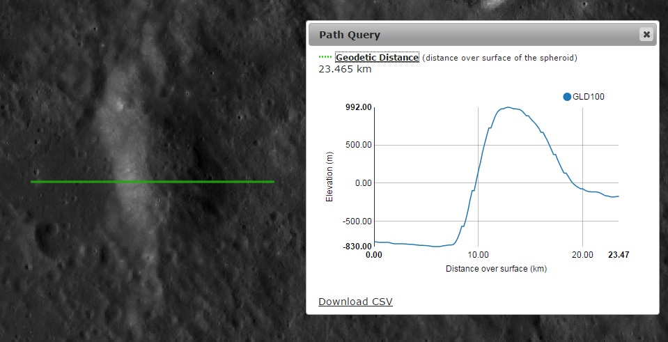 Imagem (Norte para direita): O perfil altimétrico W - E do referido monte isolado - LRO QuickMap.