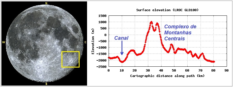 Imagem: Lua cheia mostrando a abrangência da foto mais abaixo, enfocando a região da cratera PETAVIUS. Um perfil altimétrico mostrando o complexo central de montanhas e o “corte” do grande canal, também são mostrados. Foto por VTOL - Perfil por QuickMap.
