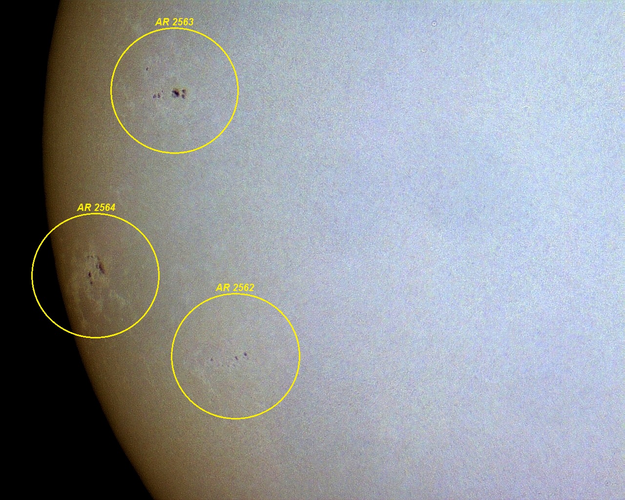 Imagem: SOL fotografado em 09 de julho de 2016 (11:45:13 hora local), apresentando 4 conjuntos de pequenas manchas solares - AR 2562, AR 2563 e AR 2564 (Telescópio APO Tele Vue 85 + Celestron Ultima 2X Barlow + Câmera Orion Starshoot Solar System IV + filtro Baader luz branca - foto com apenas 1 frame).