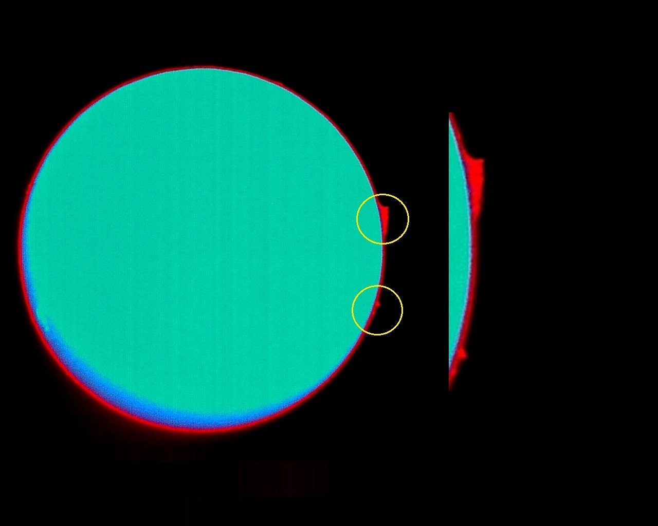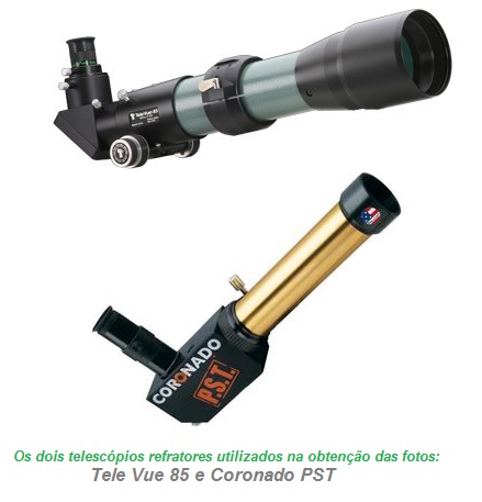 Imagem: SOL fotografado em 09 de julho de 2016 (11:28:56 hora local), apresentando proeminências no limbo oeste solar (Telescópio solar Coronado PST (filtro H-Alpha + Câmera Orion Starshoot Solar System IV - foto com apenas 1 frame).