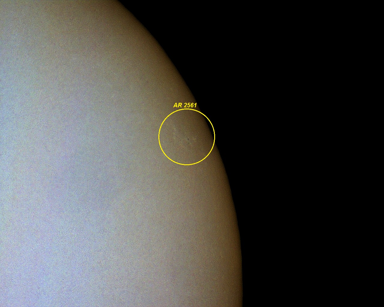 Imagem: SOL fotografado em 09 de julho de 2016 (11:41:22 hora local), apresentando o pequeno e quase imperceptível conjunto de manchas AR 2561 (Telescópio APO Tele Vue 85 + Celestron Ultima 2X Barlow + Câmera Orion Starshoot Solar System IV + + filtro Baader luz branca - foto com apenas 1 frame).