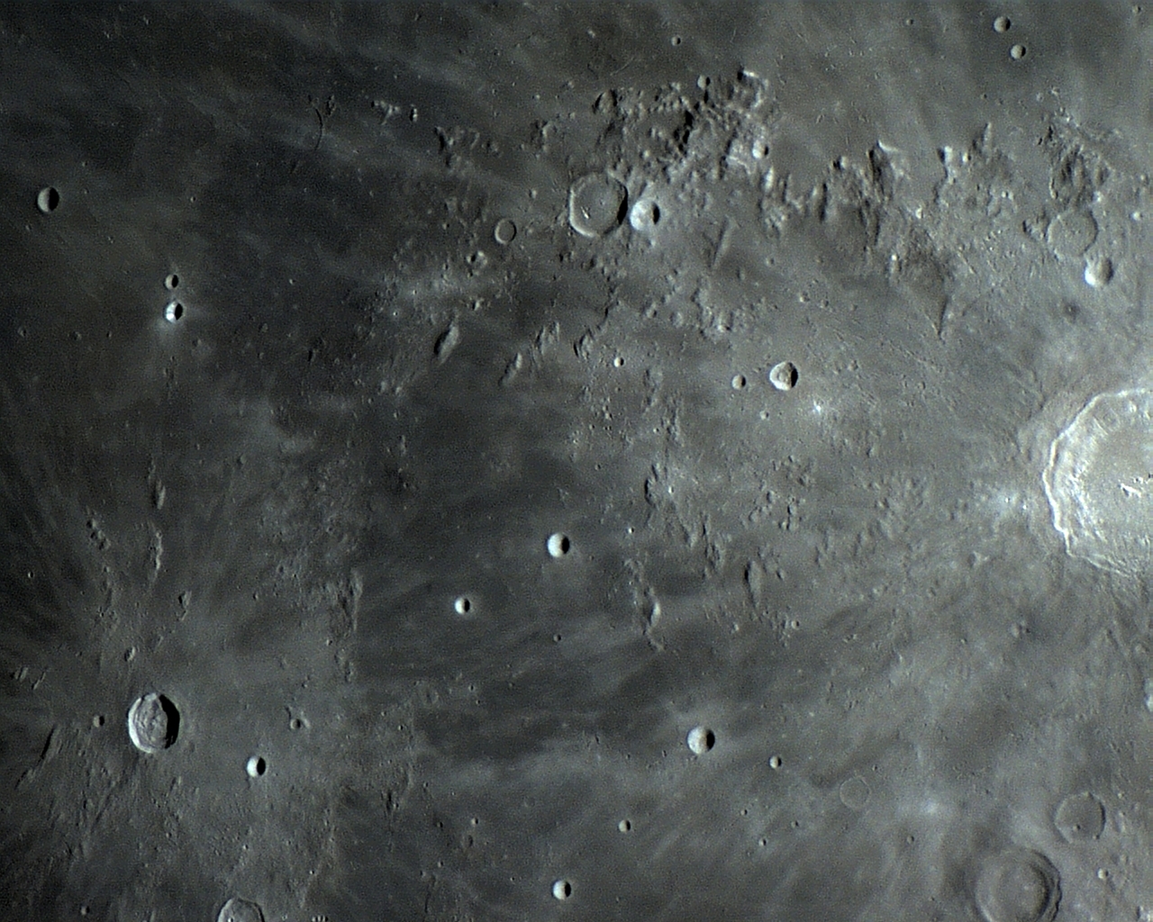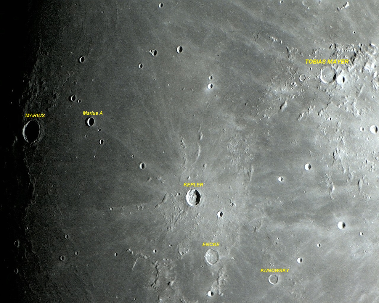 Foto: A cratera em homenagem ao selenógrafo e cartógrafo alemão TOBIAS MAYER (1723 – 1762), mostrada no canto superior direito da imagem. Ela está localizada cerca de 305 Km a nordeste da jovem e proeminente cratera KEPLER. TOBIAS MAYER tem 33 Km de diâmetro e 2,9 Km de profundidade. Ela está posicionada nas coordenadas LAT: 15° 36′ 0″ N, LON: 29° 6′ 0″ W. Foto executada com apenas 1 frame em 04 de março de 2012, 20:55:24.