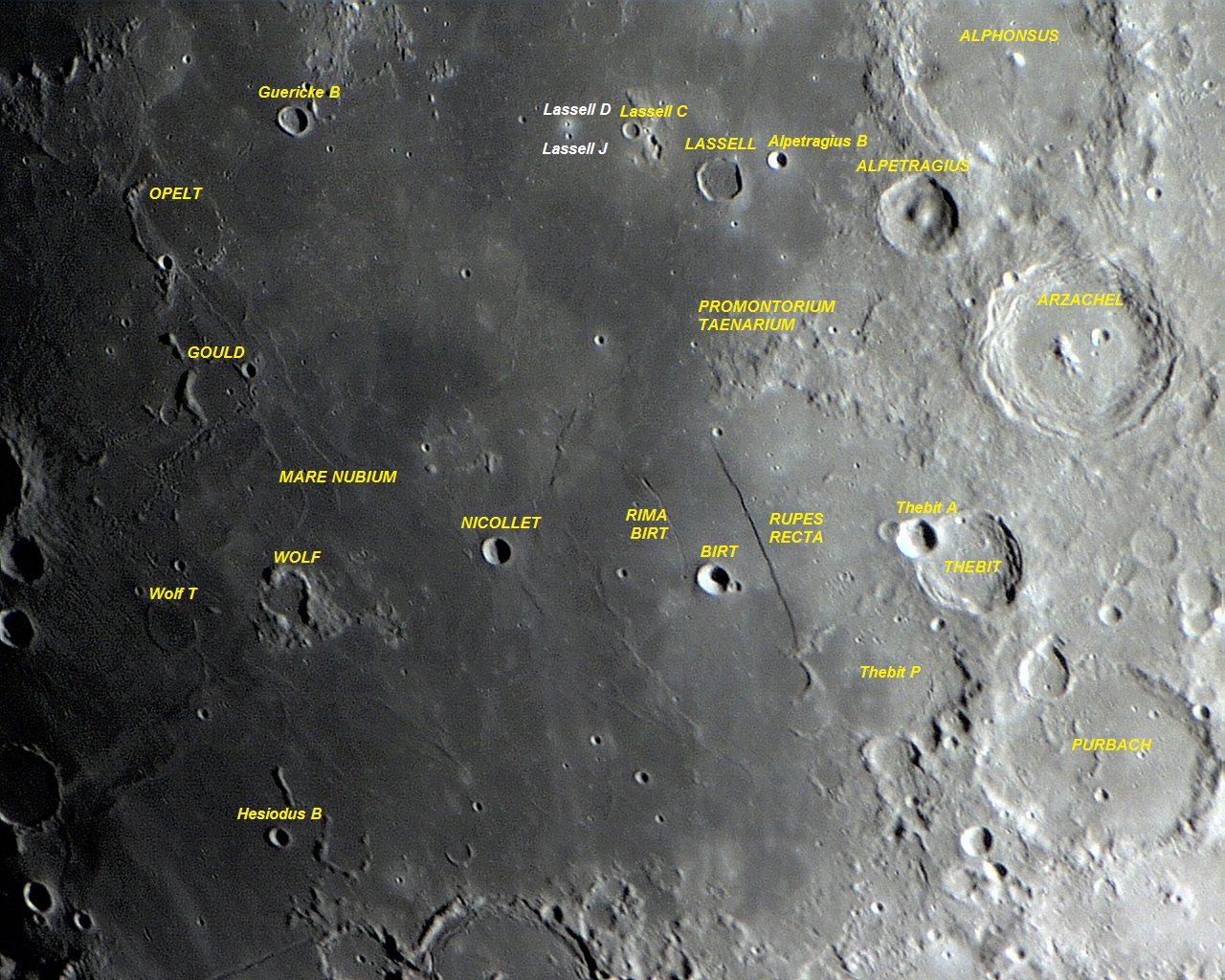 A jovem e minúscula cratera Lassell D (2 Km de diâmetro).