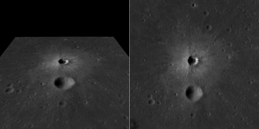 Imagem: A minúscula cratera Lassell D e sua pequena companheira Lassell J, fotografadas em voo orbital pela sonda lunar robótica LRO da NASA.