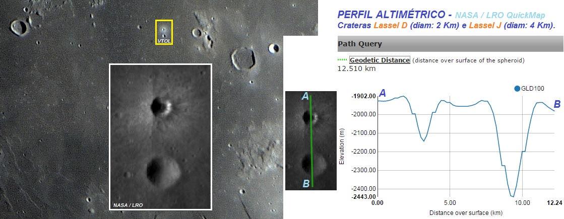 Imagem: As pequenas crateras Lassell D e Lassell J (VTOL e NASA / LRO) com seus respectivos perfis altimétricos (NASA / LRO QuickMap).