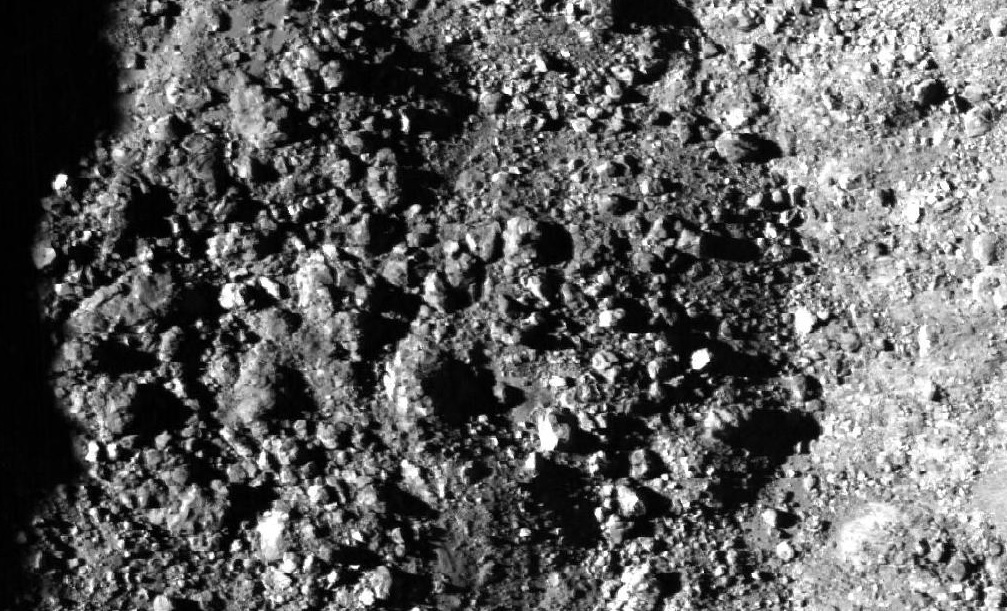 Imagem: Executando um super zoom diretamente no fundo do piso interno da cratera Lassell D, verificamos a existência de uma superfície rugosa e desnivelada, criada por materiais acumulados (pedregulhos) provenientes de deslizamentos das encostas internas - NASA / LRO QuickMap.