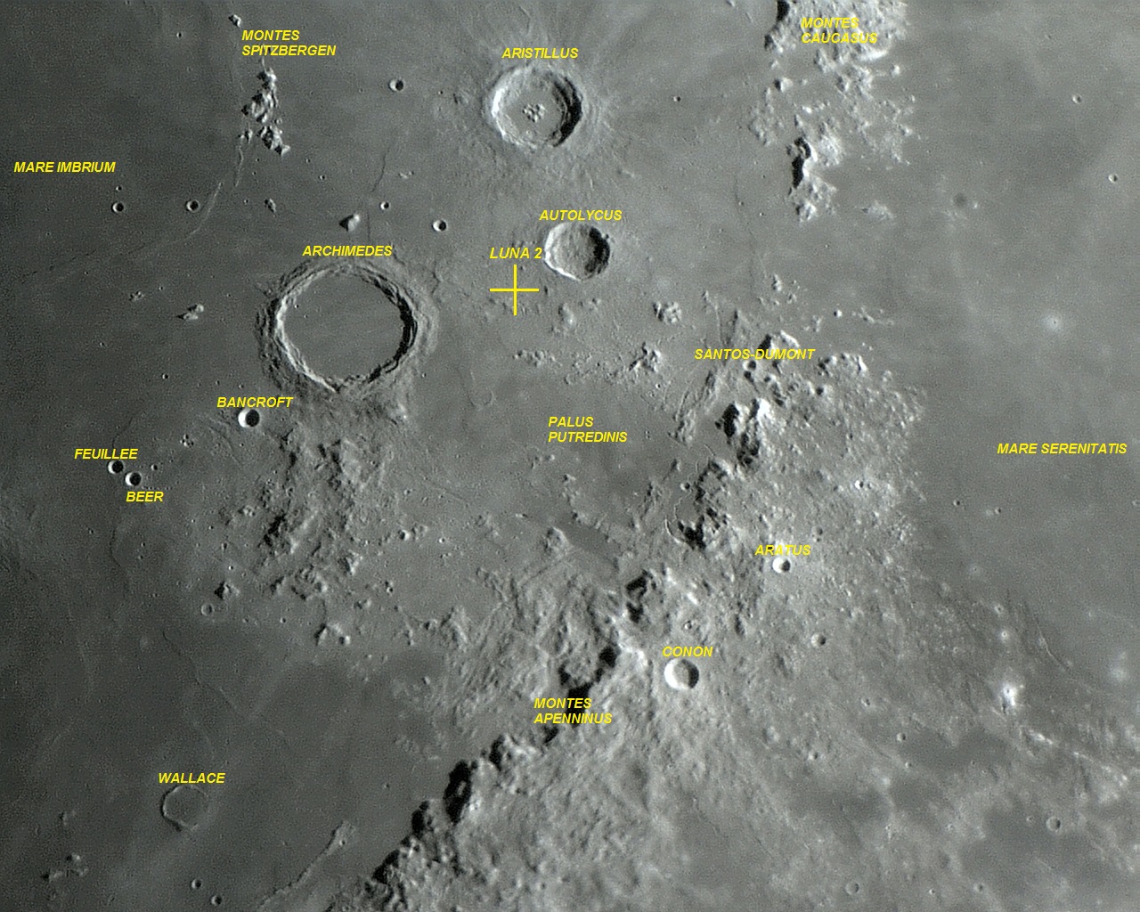 Foto: Local de impacto da sonda lunar soviética Luna 2 (o primeiro objeto feito pelo homem a alcançar a superfície da Lua), entre as crateras ARCHIMEDES e AUTOLYCUS, em 14 de setembro de 1959, às 21:04:24 UT, nas coordenadas selenográficas LAT: 29° 06′ 00″ N e LON: 00° 00′ 00″ E. Foto executada por VTOL em 29 de maio de 2012, 19:52:14 (22:52:14 UT)..