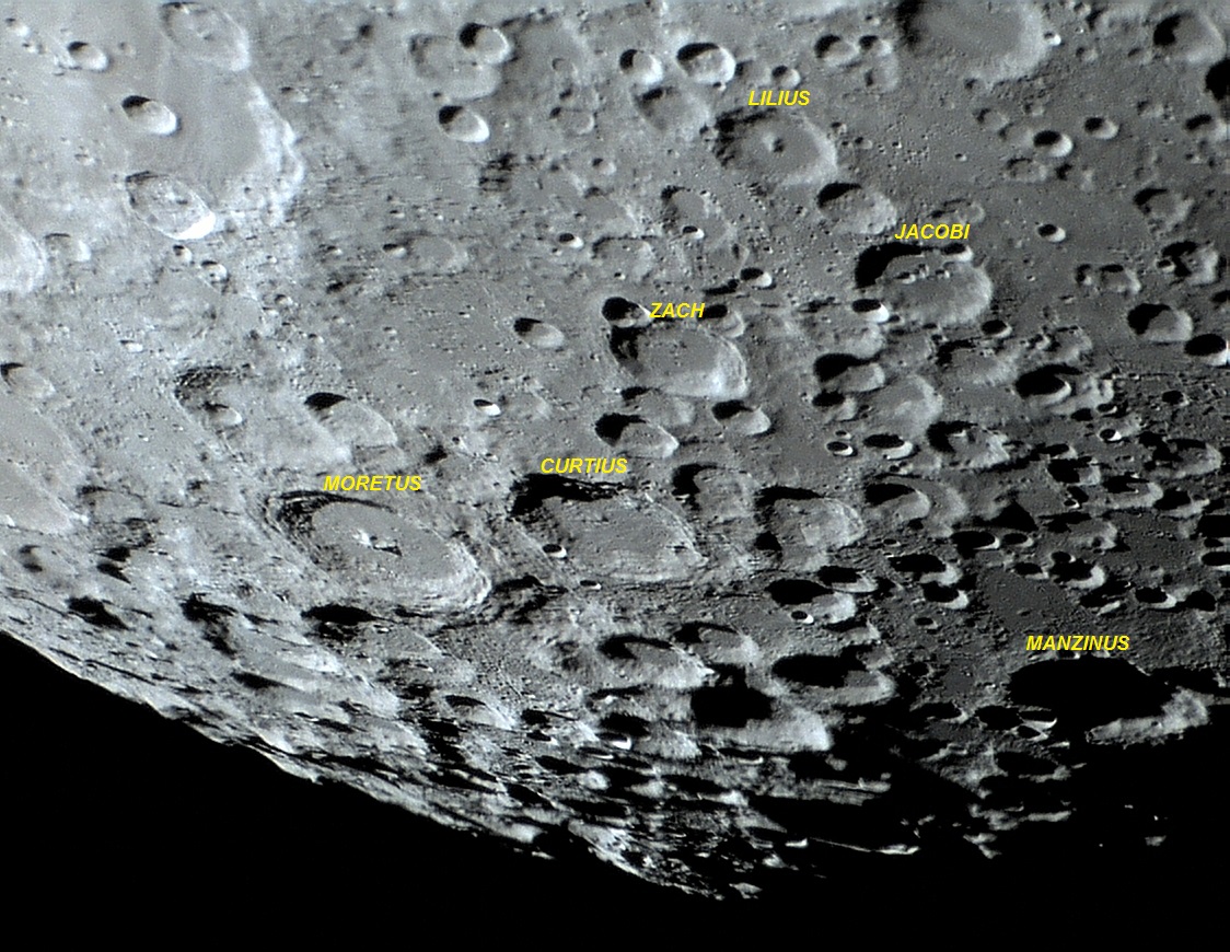 Foto: A destacada cratera de morfologia complexa MORETUS, localizada próxima do limbo lunar sul, na região das terras altas cravejadas por crateras de impactos de todos os tamanhos e idades. Foto executada por VTOL em 20 de novembro de 2013, 09:09:27.