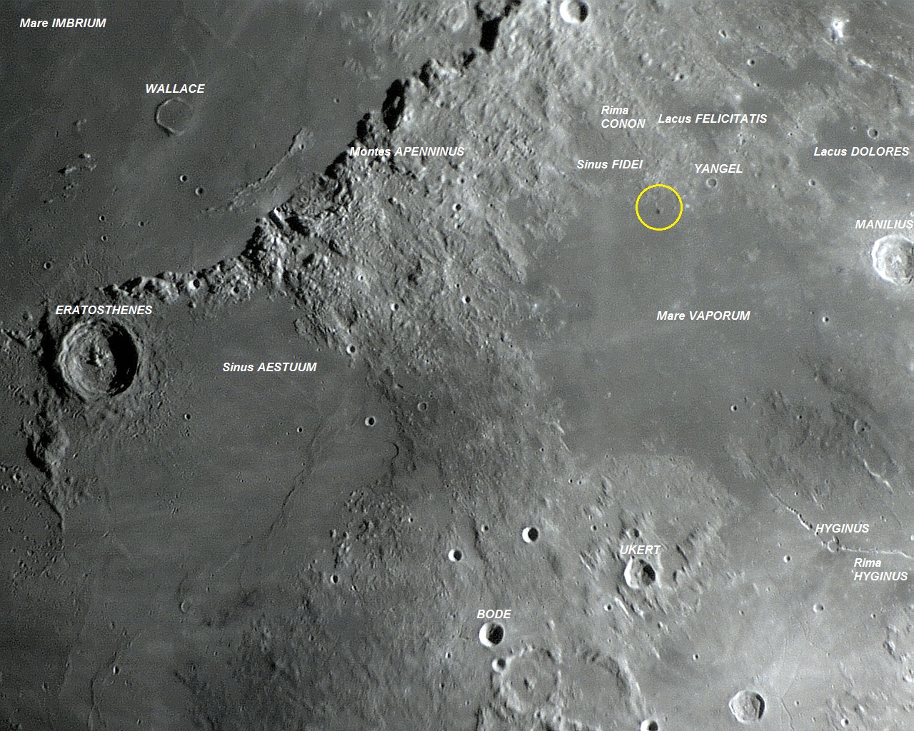 Nas lavas escuras do Mare VAPORUM, junto à orla norte, mais especificamente nas coordenadas selenográficas LAT: N 16.420o e LON: E 3.257o, existe um minúsculo e protuberante monte hemisférico. Essa interessante formação localiza-se cerca de 37 Km a sudoeste da pequena cratera YANGEL (diâmetro: 7,9 Km, profundidade: 0,6 Km).