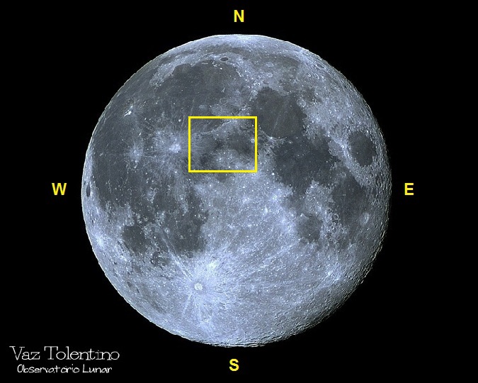 Imagem: Lua cheia apresentando a abrangência da foto enfocando o minúsculo monte hemisférico no Mare VAPORUM - VTOL.