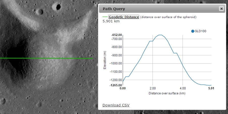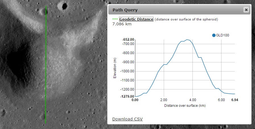 Imagem: O perfil altimétrico N - S do pequeno monte hemisférico - NASA/LRO QuickMap.