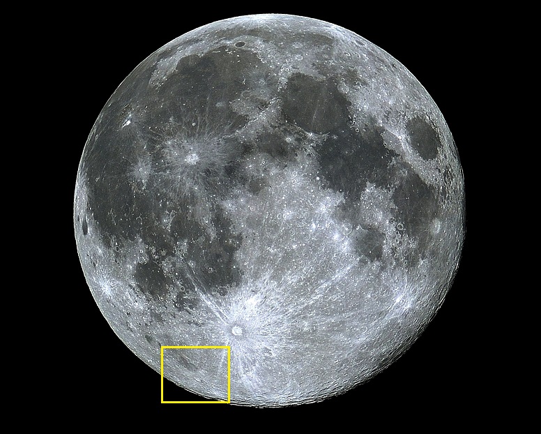 Imagem: Lua cheia apresentando a abrangência da foto enfocando a cratera HAUSEN - VTOL.