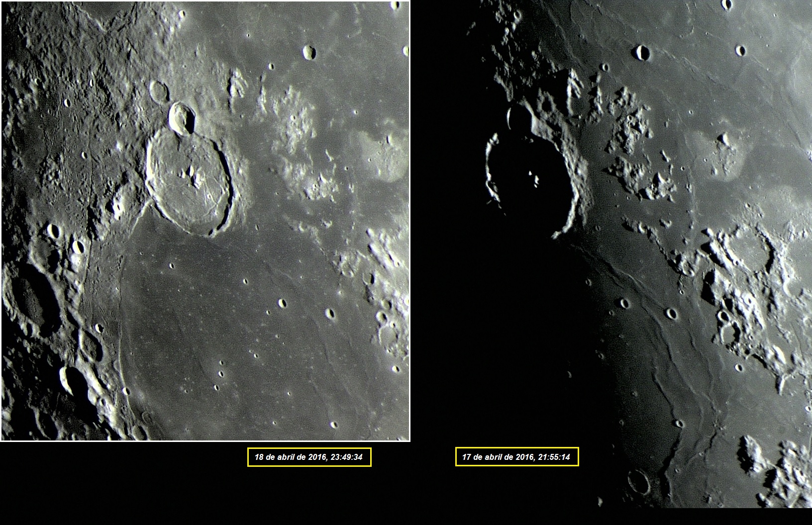 Na composição fotográfica apresentada acima, podemos observar o amanhecer na região da grande cratera GASSENDI (diâmetro: 109,6 Km, profundidade: 1,42 Km) e do vasto Mare HUMORUM (diâmetro: aproximadamente 380 Km), na Lua crescente, com menos de 24 horas de diferença de uma foto para outra. Composição fotográfica acima feita com imagens obtidas com apenas 1 frame cada, nas seguintes datas: 18 de abril de 2016, 23:49:34 (esquerda) e 17 de abril de 2016, 21:55:14 (direita).