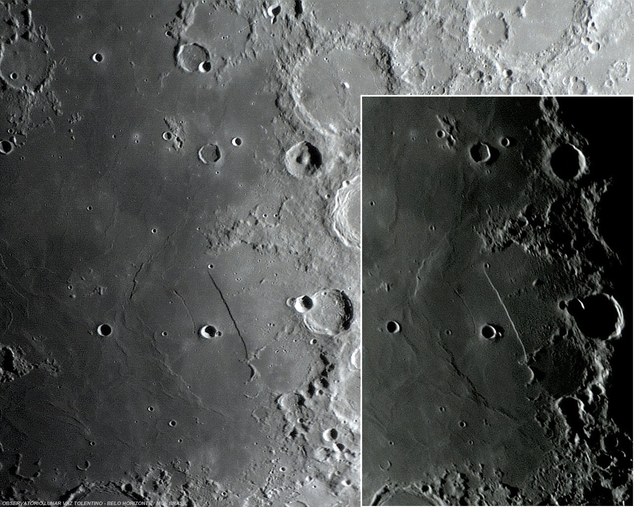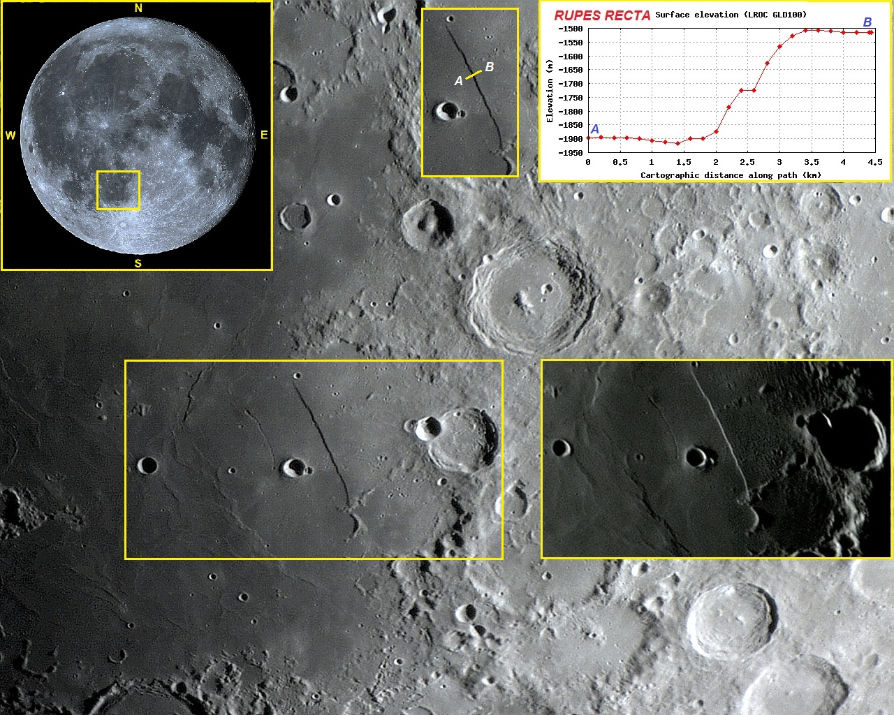 Foto: Composição fotográfica mostrando Rupes RECTA em duas situações. No detalhe da esquerda, com o Sol a leste (nascendo) e, no detalhe da direita, com o Sol a oeste (ocaso). O perfil altimétrico (LRO QuickMap) em forma de degrau de um corte transversal de Rupes RECTA também é apresentado, juntamente com a imagem da Lua cheia indicando a área de abrangência da foto principal de Rupes RECTA. Foto no detalhe da esquerda em 29 de maio de 2012, 19:32:58 e foto do detalhe da direita em 27 de março de 2011, 05:38:16. Fotos executadas por VTOL.