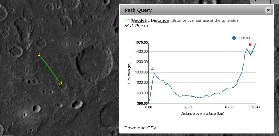 Imagem: O perfil altimétrico NW - SE da provável cratera fantasma, apresentando uma clássica concavidade - LRO QuickMap.