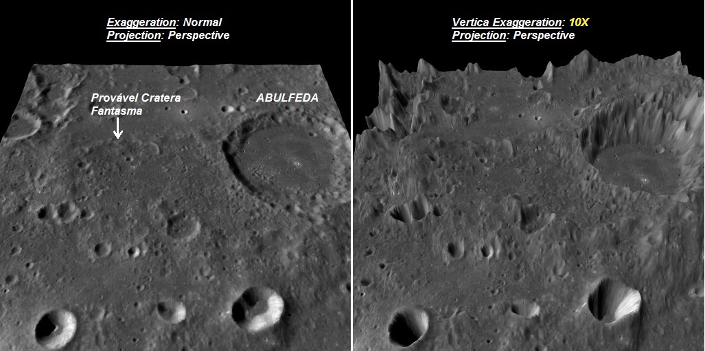 Composição: Imagem da esquerda: normal. Imagem da direita: com exagero vertical de 10X. A utilização o recurso de Search Tool do LRO QuickMap (Projection: perspective; Vertical Exaggeration: 10X), nos facilita a percepção da concavidade da provável cratera fantasma.