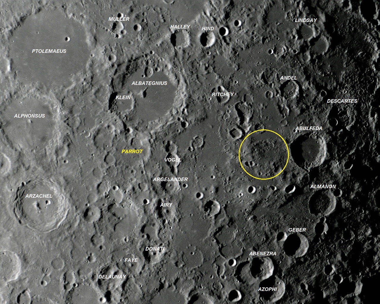 Observe na composição fotográfica abaixo, a antiga, desgastada e deformada cratera PARROT (diâmetro: 70 Km, profundidade máxima: 2 Km ), que é catalogada pela IAU e também aparece no quadro da foto em destaque de hoje, junto à borda sul da grande cratera ALBATEGNIUS (diâmetro: 131 Km, profundidade: 3,2 km). Nessa composição, ao lado da cratera PARROT, está a nossa suposta cratera fantasma (diâmetro aproximado: 45 Km, profundidade aproximada: 900 m). Apesar de PARROT ser bem maior, observe como as duas desgastadas formações são semelhantes!