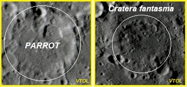 Composição fotográfica: A antiga e desgastada cratera PARROT ao lado da suposta cratera fantasma, também desgastada, identificada por VTOL na foto de 01‎ de ‎maio‎ de ‎2013, ‏‎03:08:08 (06:08:08 UT).