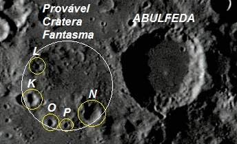 Imagem: A Cratera ABULFEDA e asuposta formação fantasma, junto de sua borda oeste. Note as pequenas crateras que estão hospedadas ao longo do desgastado aro da provável formação fantasma (Abulfeda L, Abulfeda K, Abulfeda O, Abulfeda P e Abulfeda N) – VTOL.