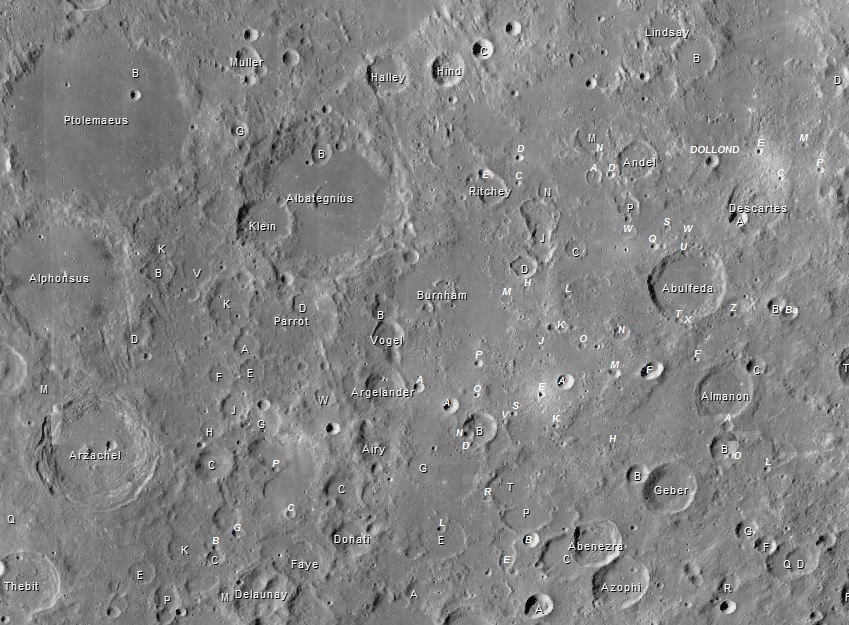 Todas as demais formações que são visíveis no quadro da foto em destaque de hoje, são catalogadas e possuem nominações próprias definidas pela IAU (as formações principais possuem nomes próprios; as formações satélites possuem o nome próprio de sua formação principal, seguida de uma letra maiúscula), com exceção de nossa suposta cratera fantasma. Veja abaixo, uma tela do Virtual Moon Atlas: