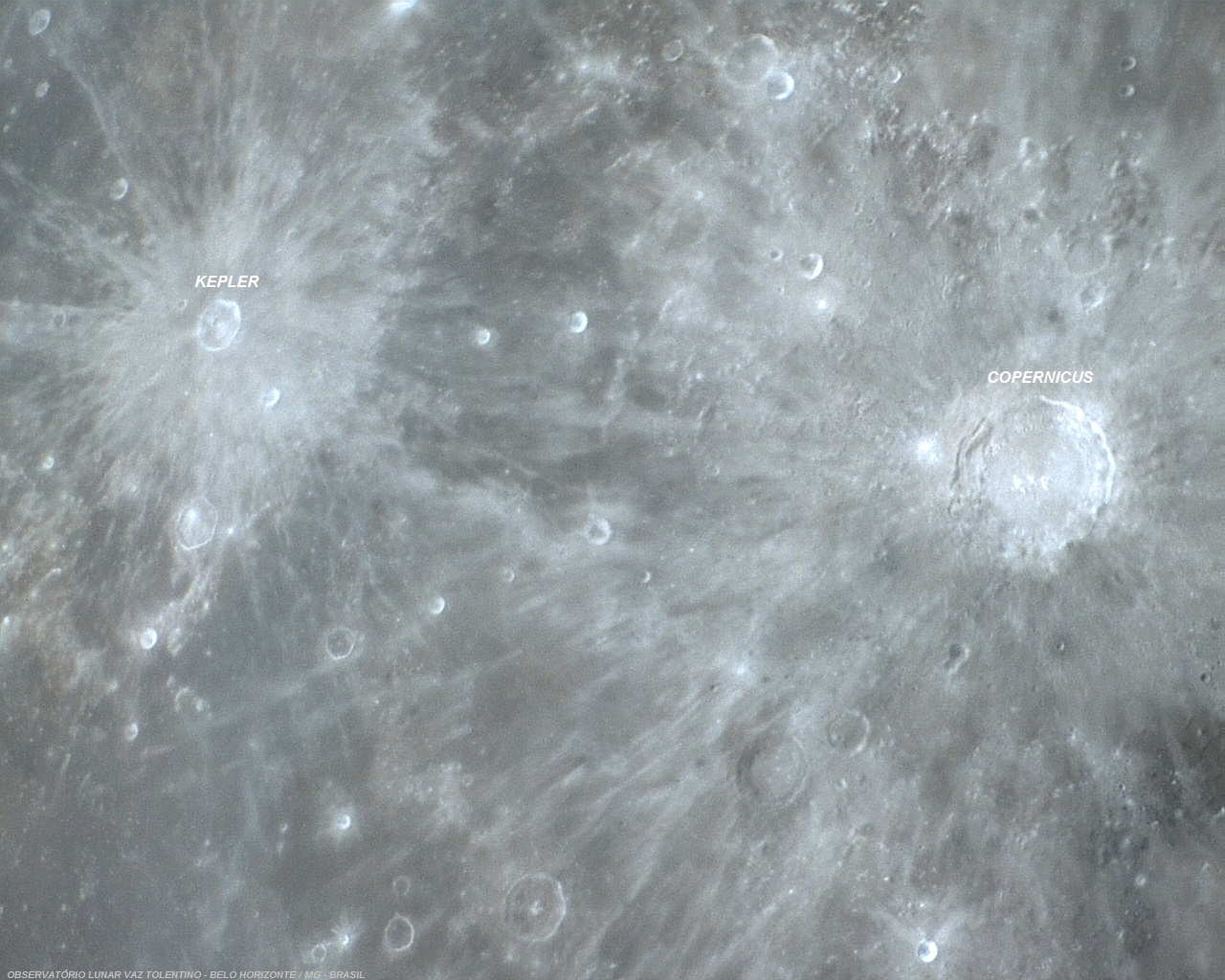 As belas e proeminentes crateras de impacto de morfologia complexa KEPLER (diâmetro: 29,5 Km, profundidade: 2,7 Km) e COPERNICUS (diâmetro: 93 Km, profundidade: 3,8 Km) destacam-se mais ainda, quando o Sol posiciona-se a pino do céu lunar. Isto porque, os fortes, explosivos e relativamente recentes impactos que escavaram essas duas crateras, ejetaram para o exterior, em todas as direções, muito material com altíssima velocidade, criando numerosos caminhamentos de raios brilhantes em longas distâncias. Os longos sistemas de raios brilhantes estendem-se por centenas de quilômetros, garantindo grande destaque e visibilidade, cobrindo os mares de lava ao redor e atravessando os raios brilhantes de outras crateras. Com o tempo, a radiação do Sol vai escurecer o sistema de raios brilhantes, mas demorará muito antes que isso aconteça.