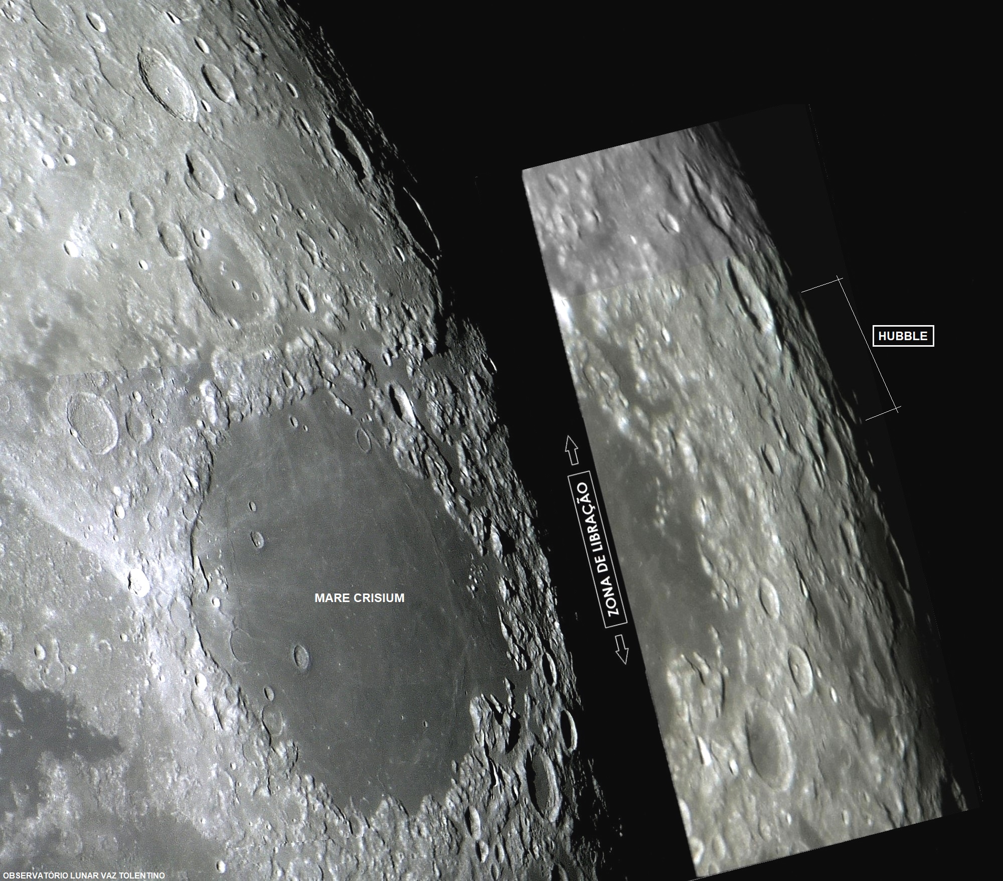 A cratera HUBBLE possui paredes desgastadas e piso interno inundado por lava basáltica escura, apresentando superfície relativamente plana.